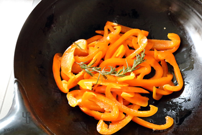 フライパンにエキストラヴァージンオリーブオイルとローズマリーを入れて弱火で熱し、オイルにローズマリーの香りを移す。ローズマリーの色が変わったら、強火にしてパプリカを加えて軽く塩コショウを振り入れて炒める。8割がた火が通ったら火からおろし、冷ましておく。 -