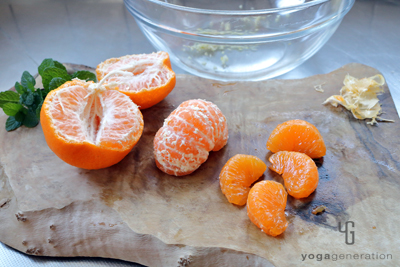 パプリカを冷ましている間に、みかんの外皮と薄皮を外して実を取り出す。ニンニクはみじん切りにする。 -