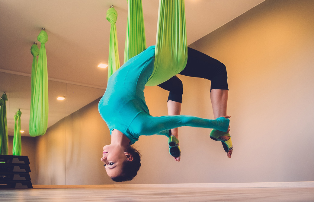 最近、空中で行うヨガが注目を集めています。「エアリアルヨガ」「空中ヨガ」「ハンモックヨガ」「無重力ヨガ」「グラヴィティヨガ」など様々な名称がありますが、これらは全てティシューと呼ばれる肌触りのよい幅広の布やハンモックを天井から吊るし、それに体の一部を引っ掛けたり、体全体を預けたりして行うヨガのこと。