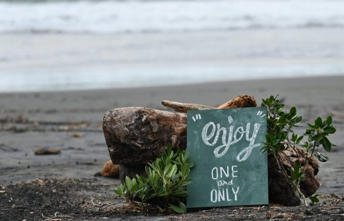今井浜にenjoyONEandONLYと書かれた黒板が置かれている